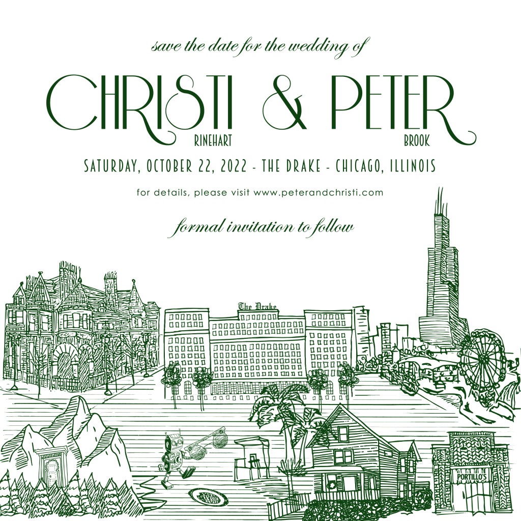 Christi and Peter wanted to tell the story of how they met, where the live now, and where they are getting married through hand sketches of different locations in California, Chicago, and Washington.