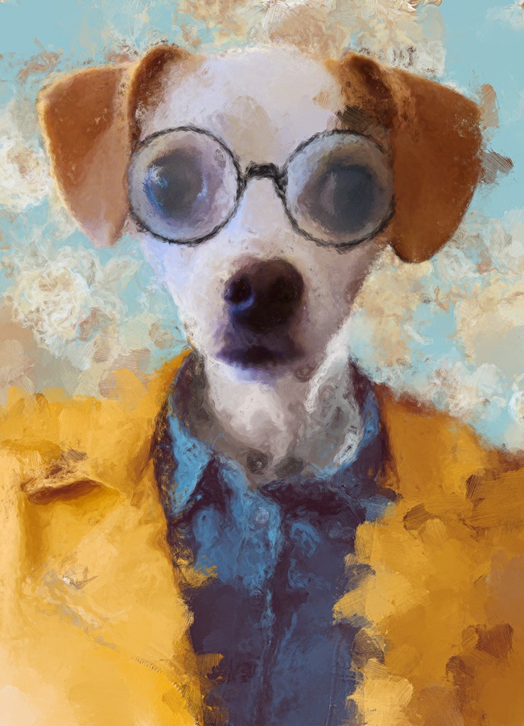An especially enjoyable subject of artwork, both personally and professionaly, is always animals. To the left is a digital painting of my 9lb chihuahua beagle mix, Charlotte, wearing glasses and a yellow jacket and looking especially chic. I’ve done a number of digital paintings of friends’ dogs as gifts over the years and there is a certain thrill that comes with creating each design.
